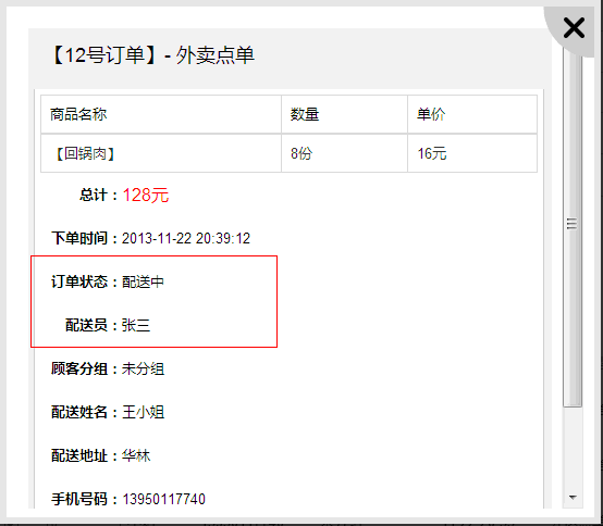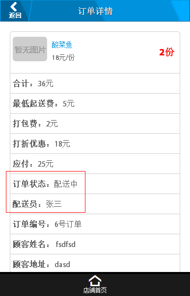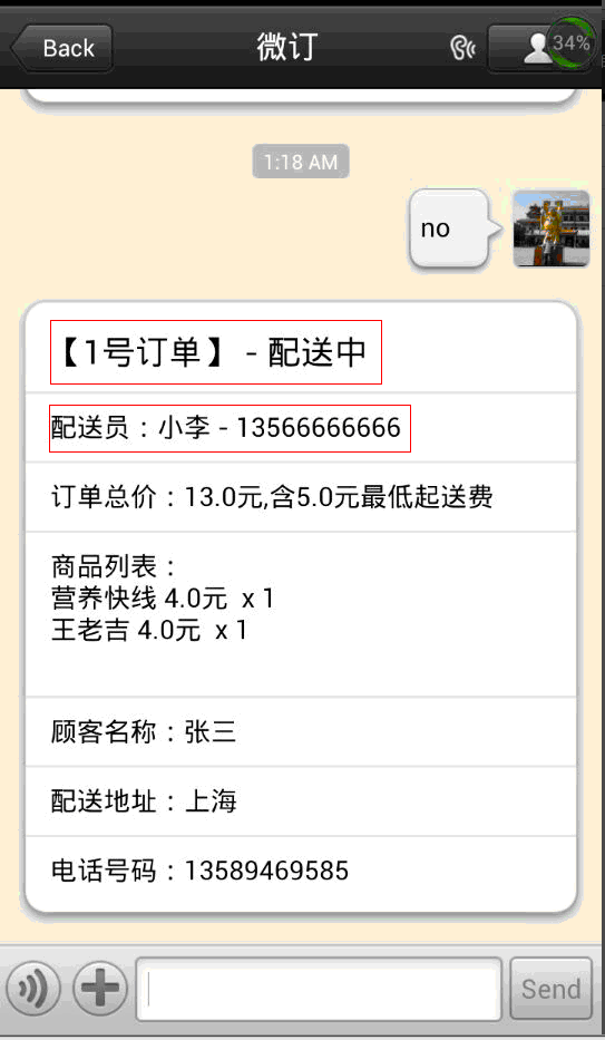同样,在手机微信端,顾客点击订单详情,也会显示订单是否配送,配送员是哪个: