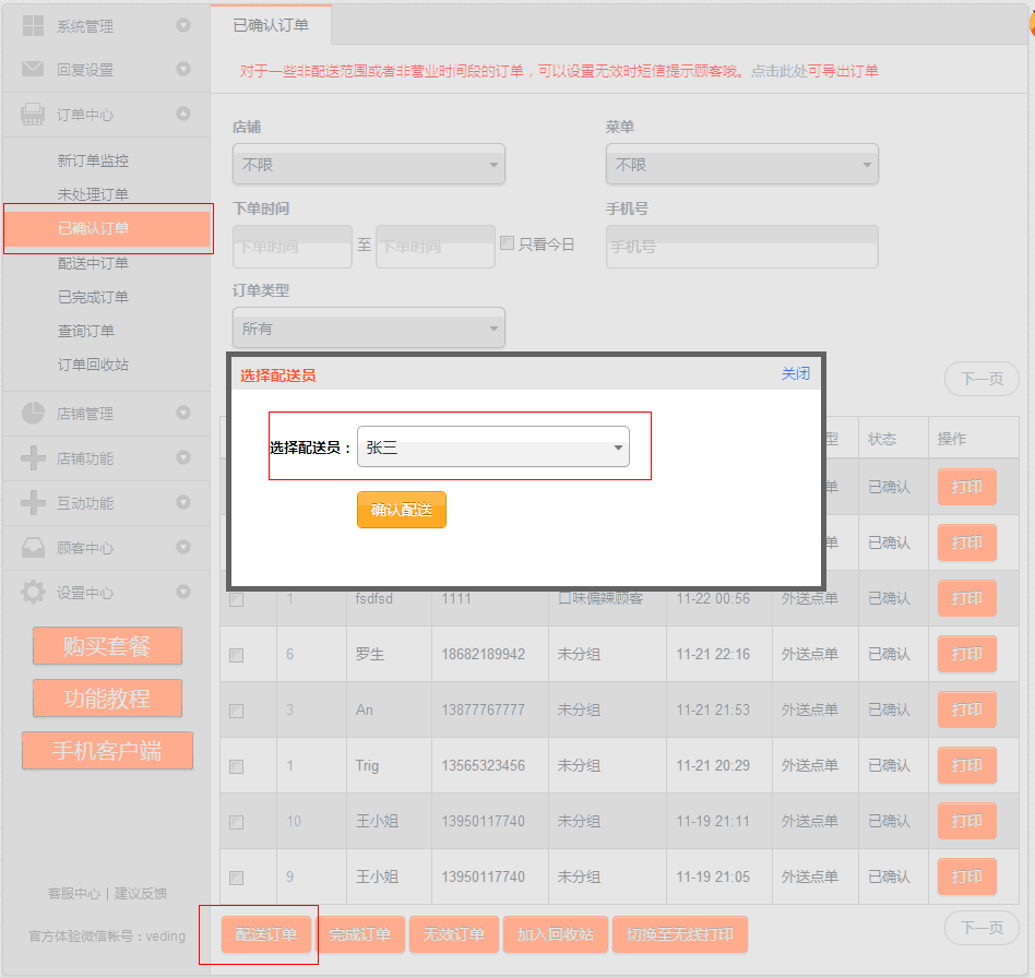 这样添加好配送员后,就可以到订单中心去操作啦。 订单中心需要说明一下。之前我们订单是有三种状态的:未处理、已确认、无效订单。而现在新增了两种状态:配送中、已完成。