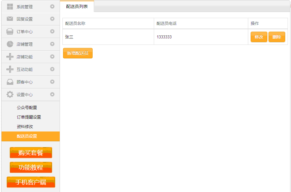 首先,商家进入系统后台,添加配送员。切换到设置中心--》配送员设置: 此页面就列出了您已添加的配送员,点击“新增配送员”可添加: 输入配送员的姓名、电话即可添加一位配送员。