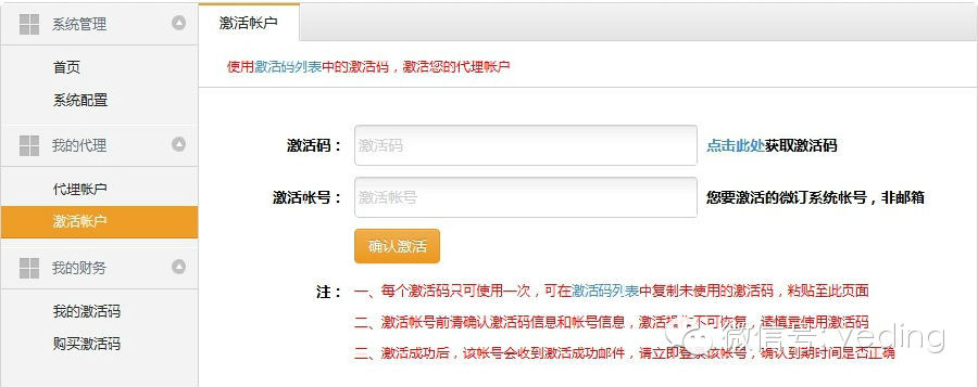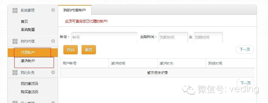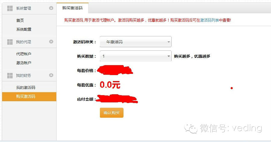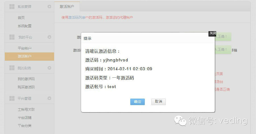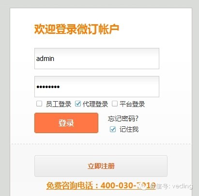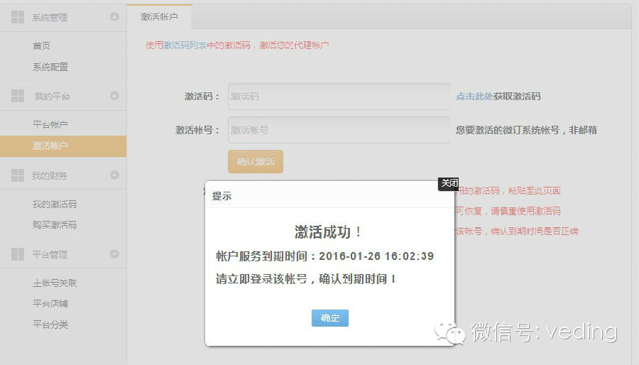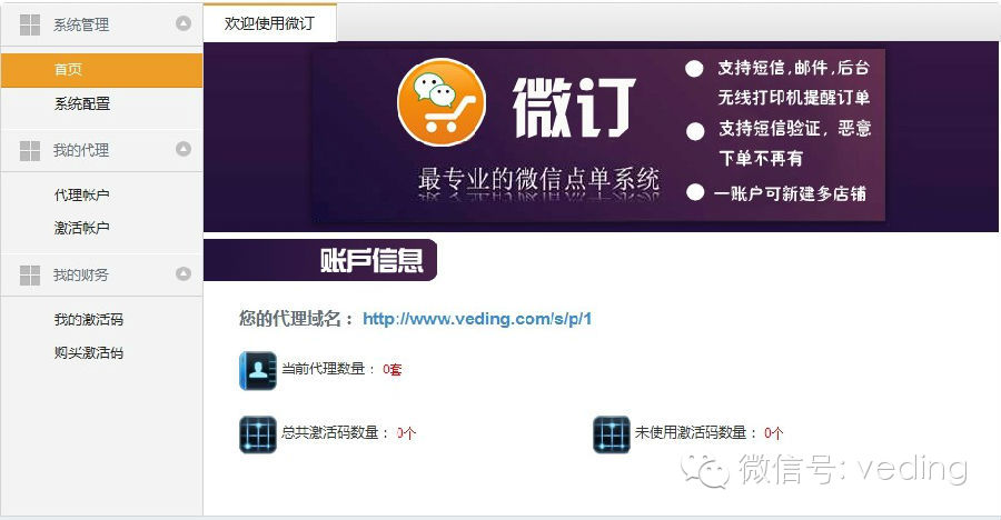 (3)通过代理后台代理商可以管理代理的客户,如查询代理的客户和激活客户的微订账号,如图所示: 为商家激活微订账号: (3)代理商可自行为客户开通使用,只需购买微订官方的激活码即可激活微订客户的使用期限,如图所示: 代理模式可以让您: 上一条:微订微信订餐系统平台模式介绍 免责声明:部分文章信息来源于网络以及网友投稿,本网站只负责对文章进行整理、排版、编辑,是出于传递更多信息之目的,并不意味着赞同其观点或证实其内容的真实性,如本站文章和转稿涉及版权等问题,请作者及时联系本站,我们会尽快处理。 责任申明:官方所有内容、图片如未经过授权,禁止任何形式的采集、镜像,否则后果自负! 标题:微订微信订餐系统代理模式介绍 地址:https://www.veding.com/static/v2/notice/56.html 相关资讯