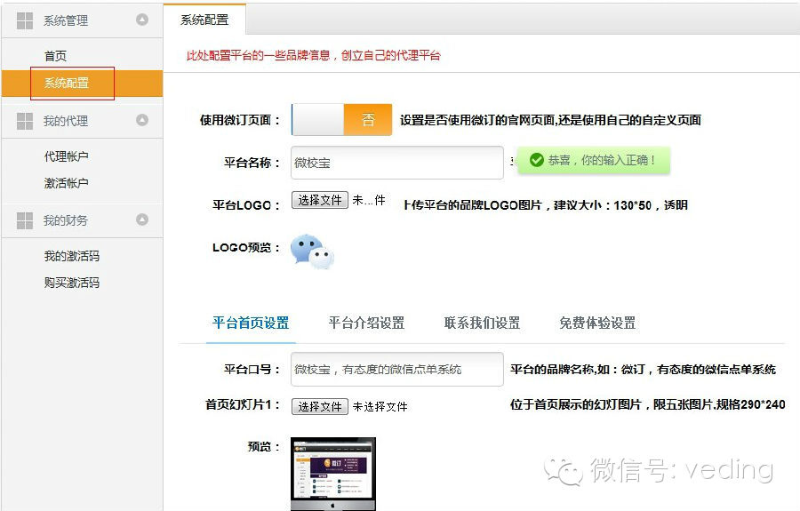 (2)系统配置设置代理商的官网名称,官网logo,以及文字介绍等。这样代理就可以推广商自己官网啦,如图所示: 后台设置好后,访问代理域名即可查看修改后的首页: