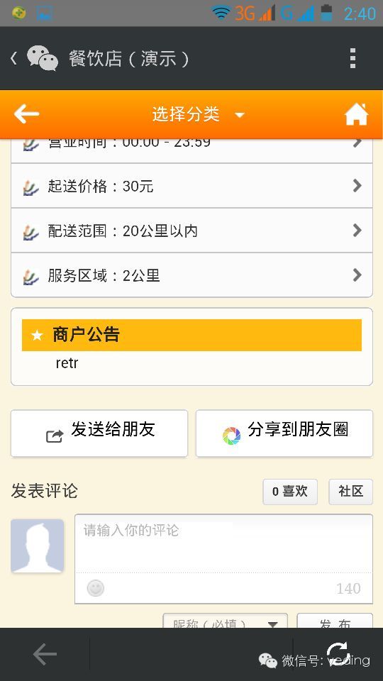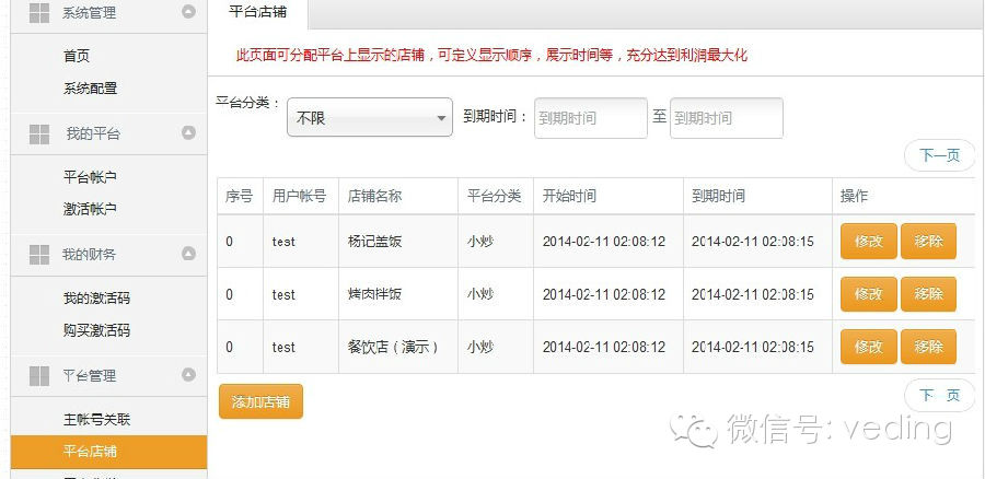 3、平台商也可以像代理商一样通过后台激活自己的商家账号使用期限(必须在后台购买激活码) 4、平台的管理是平台系统最主要的,平台管理包括了平台的店铺管理,平台的分类,主账号关联。 (1)平台商可以通过后台将其代理的商家账号下的所有店铺添加至平台上来(要新建平台分类),如图所示: (2)添加的店铺将在手机微信界面显示如下图所示: 点击店铺进入内页: