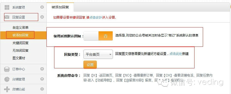 (4)主账户关联是什么功能呢?其实就是与平台商之前在微订注册的账号进行绑定,这样平台就拥有了微订系统后台一样强大的功能呢,平台商关联之后那么在微订系统后台设置的回复功能,自定义菜单,幻灯片修改都可以运用到平台上来,(特别说明:平台商除了需要申请平台账号以外,还得提前注册微订账号并且配置好微信公众账号,关联之后才能扫描二维码进入平台店铺) (5)关联主账户之后还需操作关键的步骤:登陆主账户,进入回复设置——被添加回复,选择“否”然后选择回复类型为“平台首页”( 设置后顾客关注平台的二维码即显示平台首页)