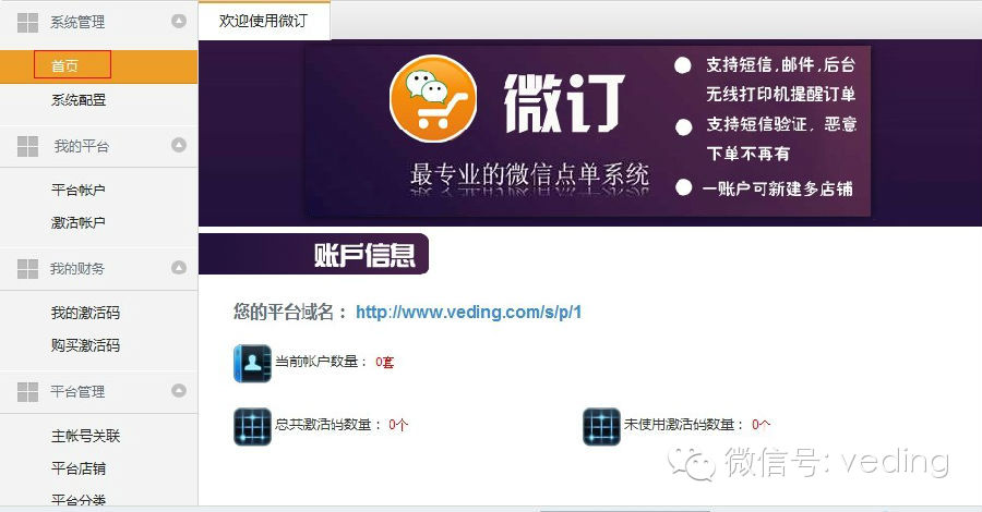 微订微信订餐系统平台模式介绍 admin 发表于 2014-02-11 11:54:30 平台模式和代理模式相似,除了可以拥有自己品牌外,还可以拥有一个点单平台。什么是点单平台?比如你是某地区的一个商家,你想把你本地的其它商家店铺集中到一个平台,让你们本地的这商家入住从的点单平台,然后你来推广这个平台,让你的本地消费者进入这个平台进行点单,从而你就可以向入住的商家们收取费用了。还有商家首页置顶、排名靠前等竞价服务,让你充分发展自己的本地o2o。 1、目前我们的平台版本是免费开放的,想做平台的用户只需提交平台申请表给我们的客服,我们审核通过后将分配其平台的登陆账号,平台商登陆平台后台即可进入首页,如图所示: 2、登陆平台商后台将看到平台的账户信息,同时出现“您的平台域名”,点击平台域名(平台商也可以自己购买域名)就是平台商的官网,像微订一样的官网只是里面的图片logo,网站名称都可以在后台的系统配置里面进行自定义设置,如图所示: