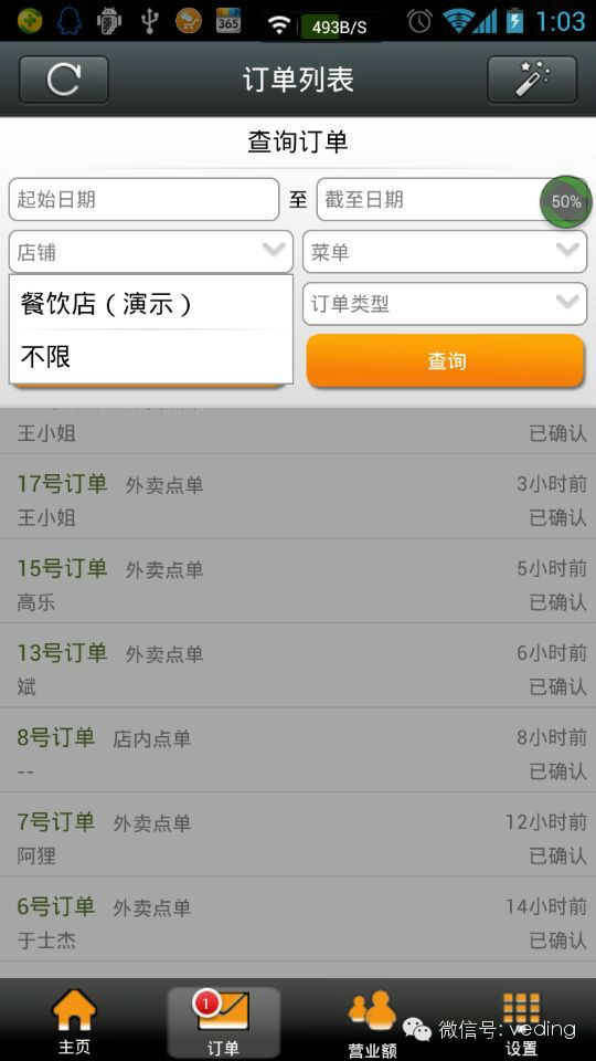 首页显示了员工管理的店铺、未处理订单等。同时员工帐号可查看他管理店铺下的订单: