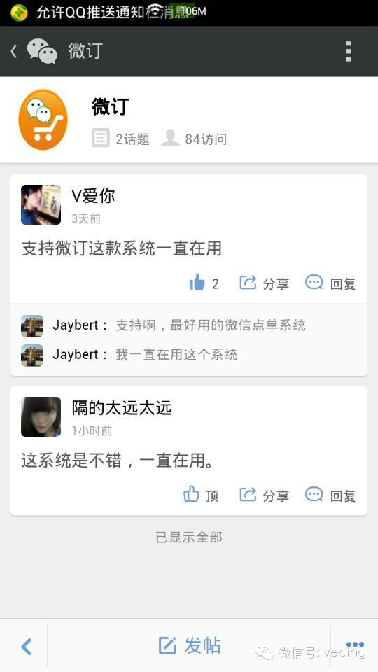 另:因微订于昨天晚上发布了新版Android客户端,请大家下载最新版本,以让您更好的使用系统。 免责声明:部分文章信息来源于网络以及网友投稿,本网站只负责对文章进行整理、排版、编辑,是出于传递更多信息之目的,并不意味着赞同其观点或证实其内容的真实性,如本站文章和转稿涉及版权等问题,请作者及时联系本站,我们会尽快处理。 责任申明:官方所有内容、图片如未经过授权,禁止任何形式的采集、镜像,否则后果自负! 标题:微订微信订餐系统完美支持微社区 地址:https://www.veding.com/static/v2/notice/63.html 相关资讯