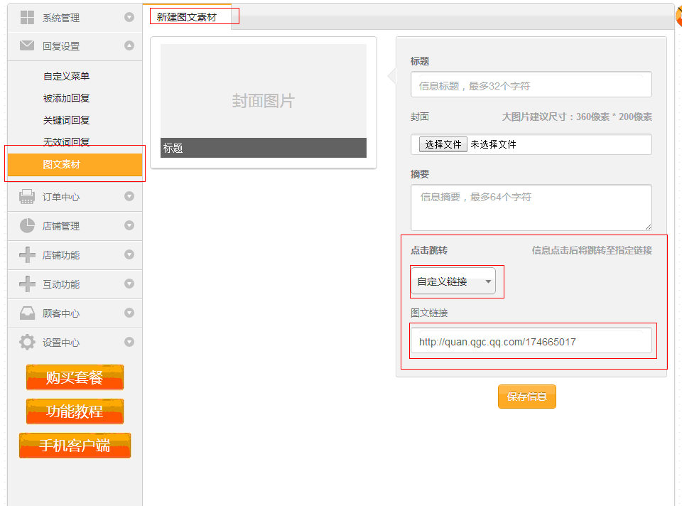 第二、自定义图文素材,也可以引入微社区: 新建一个图文,选择自定义链接,放入您的微社区链接,顾客点击图文就可以进入您的微社区了