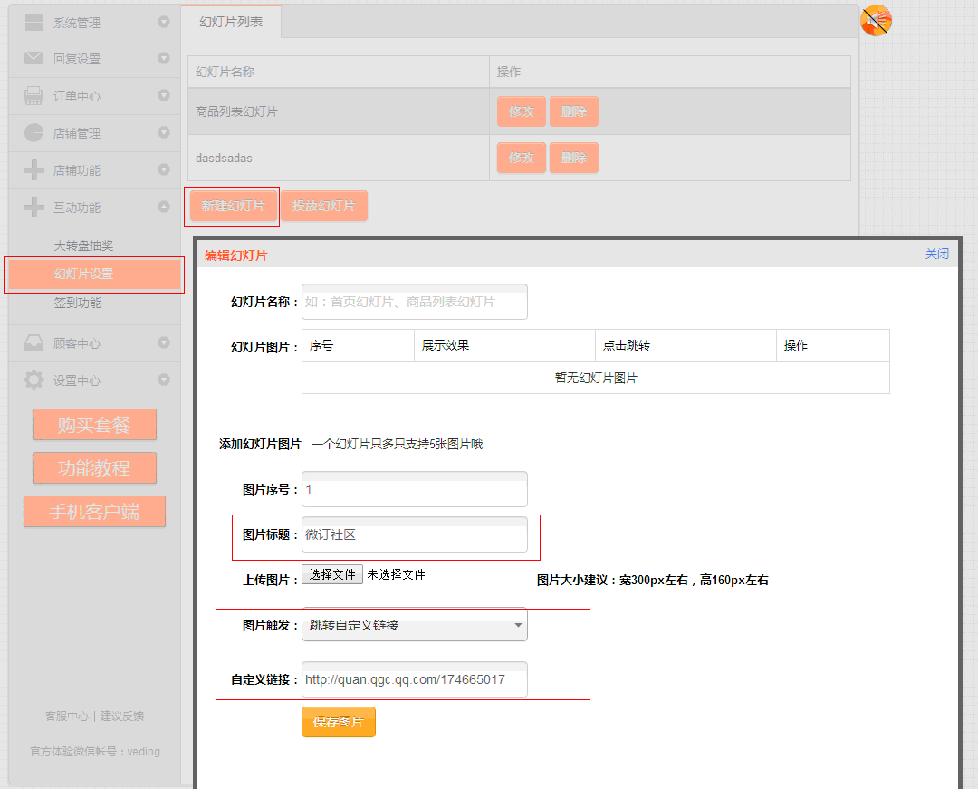 三、新建幻灯片,也可以引入微社区,显示更加醒目: 新建好幻灯片后,你就可以将你的幻灯片投放到平台首页,平台分类页面和店铺的其它页面,让用户更方便的进入您的微社区。