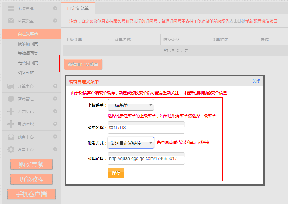 而这个社区链接,就可以用在微订里面。具体如何使用呢? 第一、自定义菜单,增加社区入口: 这样你就能够创建一个自定义菜单,点击进入您的微社区。