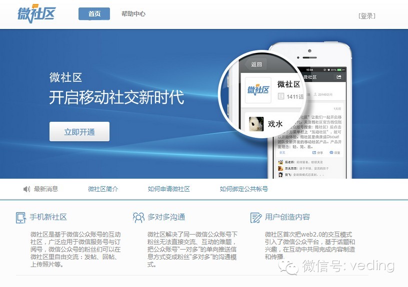 微社区是基于微信公众账号的互动社区,广泛应用于微信服务号与订阅号,微信公众号的粉丝们可以在微社区里自由交流:发帖、回帖、上传照片等。微社区解决了同一微信公众账号下粉丝无法直接交流、互动的难题,把公众账号“一对多”的单向推送信息方式变成粉丝“多对多”的沟通模式。微社区首次把web2.0的交互模式引入了微信公众平台,基于话题和兴趣,在互动中共同完成内容制造和传播。