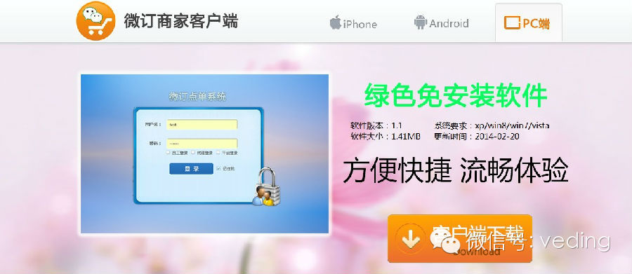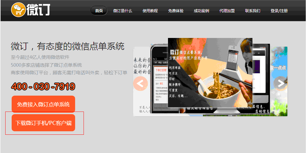 微订首发,PC客户端震撼上线! admin 发表于 2014-02-20 02:34:36 微订继上次首家发布Android客户端后,终于又一次率先推出了PC客户端,将微信点单行业引领向前,成为全国首家发布PC客户端的点单系统。 商家只需在官网下载pc端免安装软件,即可实现快捷登陆系统后台了,登陆微订和登陆QQ一样一样的,方便快捷,商家再也不需要打开浏览器进入微订官网登陆了,鼠标轻轻点击电脑桌面微订软件,就可以轻松登陆微订系统后台进行管理,抛开繁琐的浏览器登陆,是不是太方便啦。还在等神马,一起来看看微订PC客户端的庐山真面目吧。 1、首先大家需要在我们的官网,进入PC客户端下载: