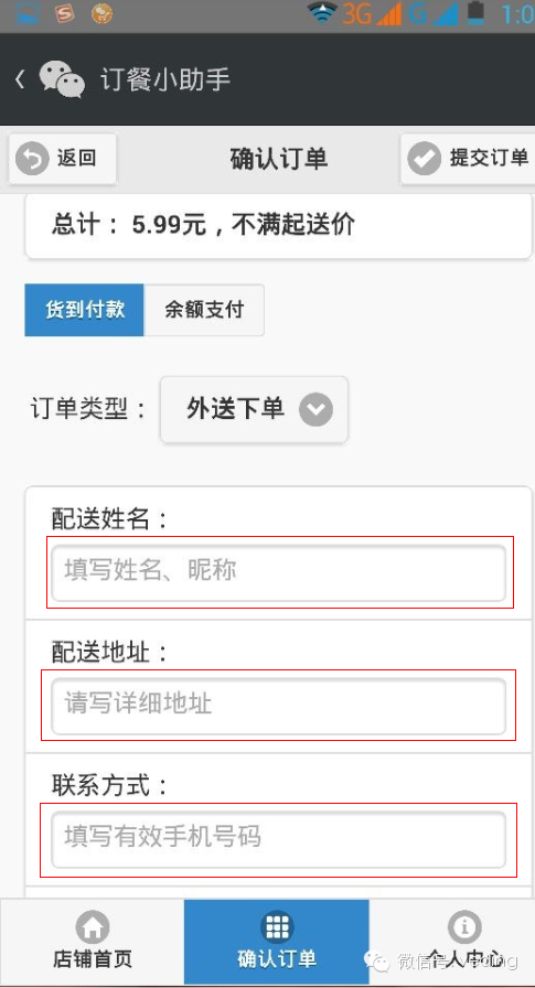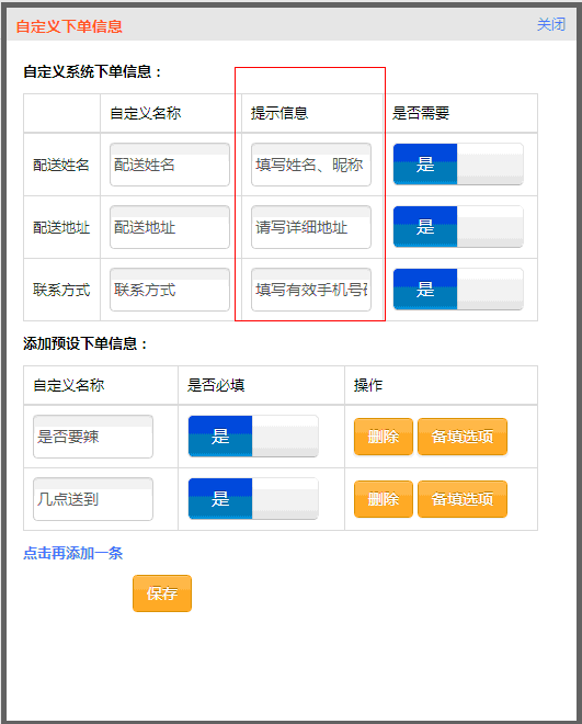 2、这次升级还支持了“自定义提示信息”,那么什么是“自定义提示信息”呢?就是在提交订单的时候填写的姓名,地址框框里面的提示语,如“填写姓名、昵称”,“详细地址”等,如下图所示: