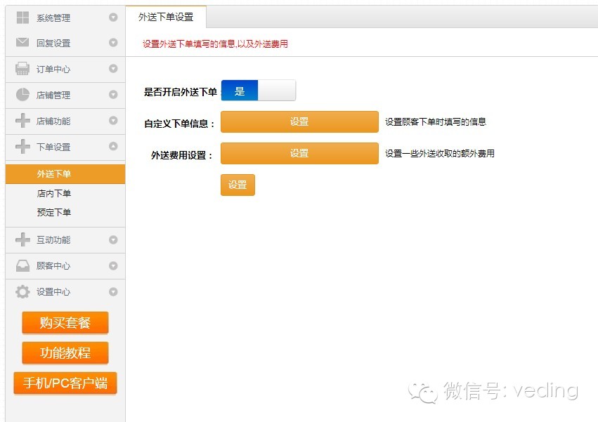 商家正确的填写“提示信息”可以有效的避免顾客错误的填写信息,而造成无效订单的生成。具体在哪里设置呢?在订单设置模板,选中外卖下单,开启外卖下单,设置自定义下单信息,如下图所示: 上一条:商家可以设置默认下单类型 下一条:系统后台新增下单设置菜单功能 免责声明:部分文章信息来源于网络以及网友投稿,本网站只负责对文章进行整理、排版、编辑,是出于传递更多信息之目的,并不意味着赞同其观点或证实其内容的真实性,如本站文章和转稿涉及版权等问题,请作者及时联系本站,我们会尽快处理。 责任申明:官方所有内容、图片如未经过授权,禁止任何形式的采集、镜像,否则后果自负! 标题:外送下单系列功能升级 地址:https://www.veding.com/static/v2/notice/76.html 相关资讯
