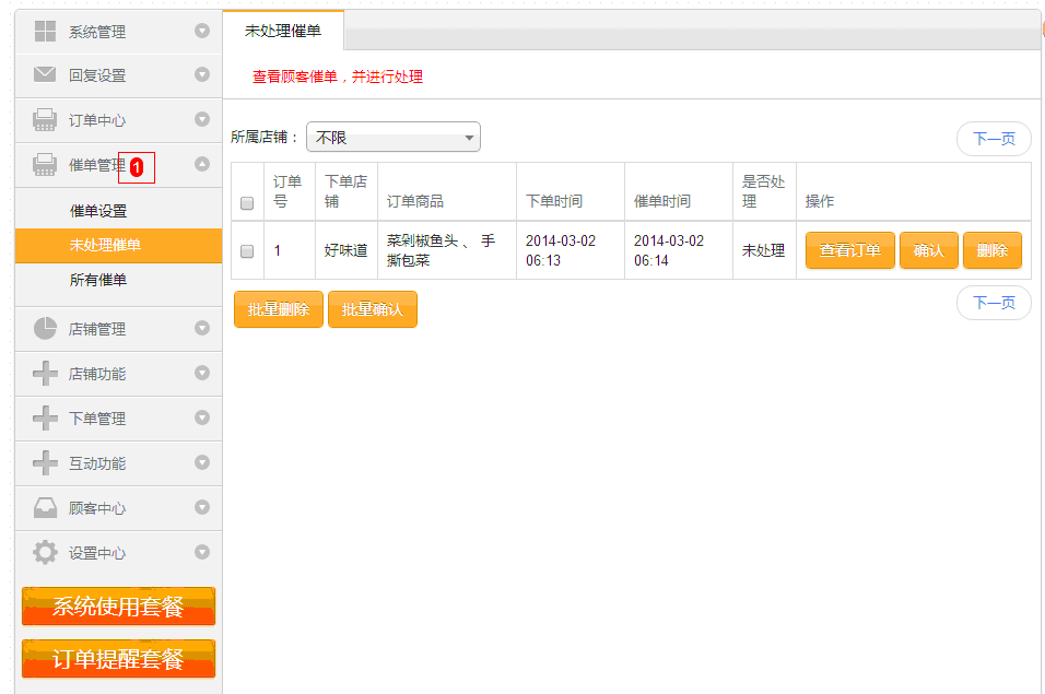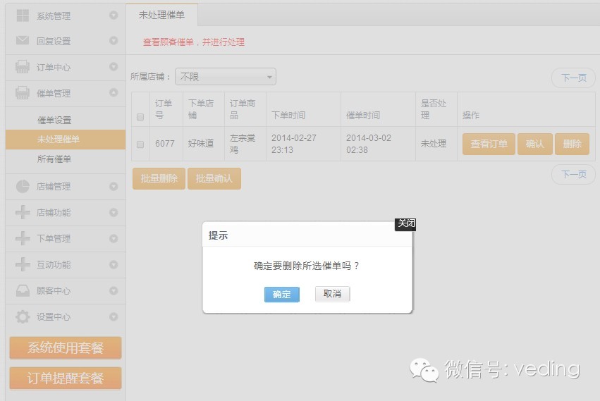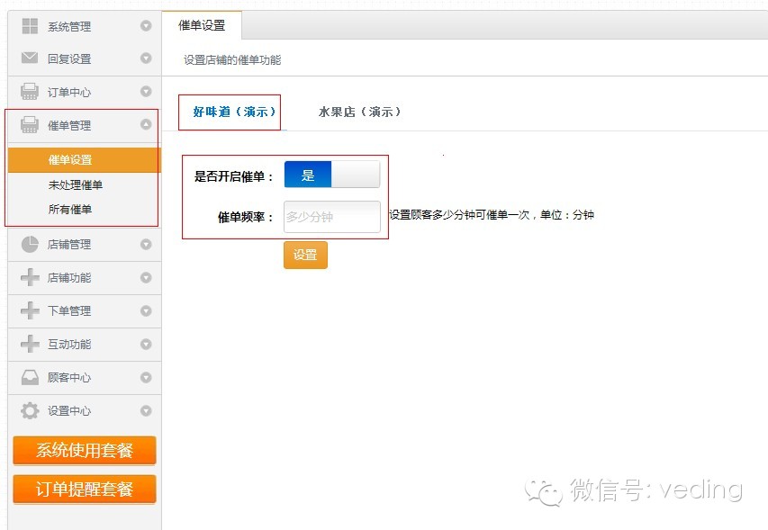 那么,客户如何才能在提交订单后进行催单呢?首先,商家必须在微订系统后台开启催单功能,并且对该功能进行设置,才能让客户进行手机催单哦,具体操作,如下所述: 1、登陆微订系统后,找到催单管理功能,进行催单设置,开启催单功能,设置催单频率,比如设置“五分钟可催单一次”,那么客户五分钟内只能催单一次,有效的控制客户频繁催单。 2、除了设置催单功能,通过催单管理还可看到未处理的催单订单,可以对催单订进行确认,删除处理。 当有顾客催单时,后台将有提示音响起,并在催单管理功能栏显示催单数量(标红),商家听到催单提示音即可进入未处理催单查看,并进行相应的处理,如:查看被催单的订单、删除、确认催单等。