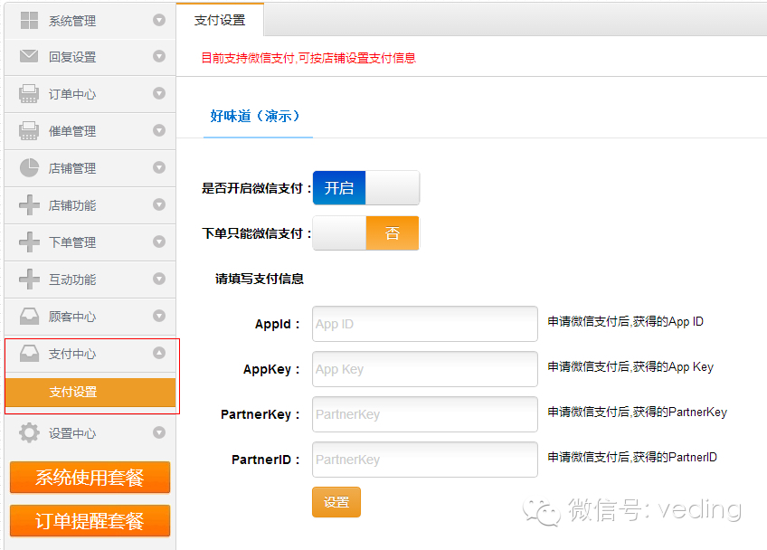 那么,如何与微订系统对接微信支付呢? 首先,登录微订后台,点击“支付中心”,进入支付设置: 此页面主要设置微信支付所需要的参数,同时支持开启和关闭微信支付。 如果选择下单只能使用微信支付,那么顾客下单时就需要先使用微信支付完成付款,才能提交订单!此项不建议商家开启,因为微信支付并还没有形成一种习惯,强制用户使用微信支付可能会降低订单的成交量。