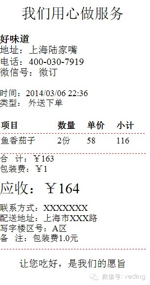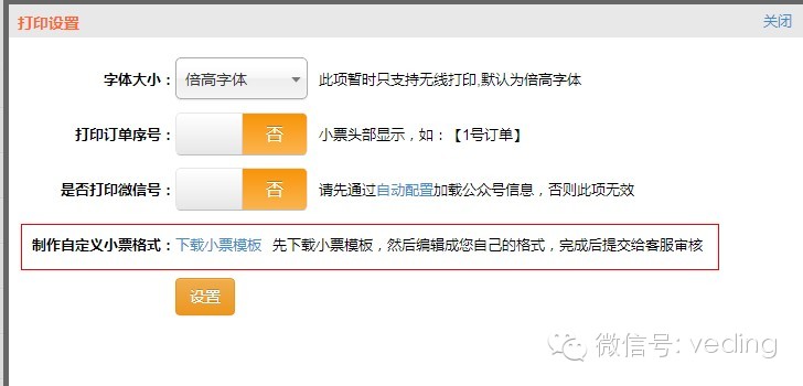 后台小票打印格式支持自定义啦 admin 发表于 2014-03-08 01:33:43 之前有很多商家提出小票格式的需求,而且每个商家需要的小票格式都不一样,出于这种情况,微订为了让大家更好的使用我们秕,满足所有商家的小票格式需求,特此推出了自定义小票格式功能,有了此功能后,商家想怎么样打印自己的小票就可以怎么打印。下面一起来看下如何自定义自己的小票格式: 我们即可看到弹出的设置页面,其中有个自定义小票格式,先下载个小票模板。