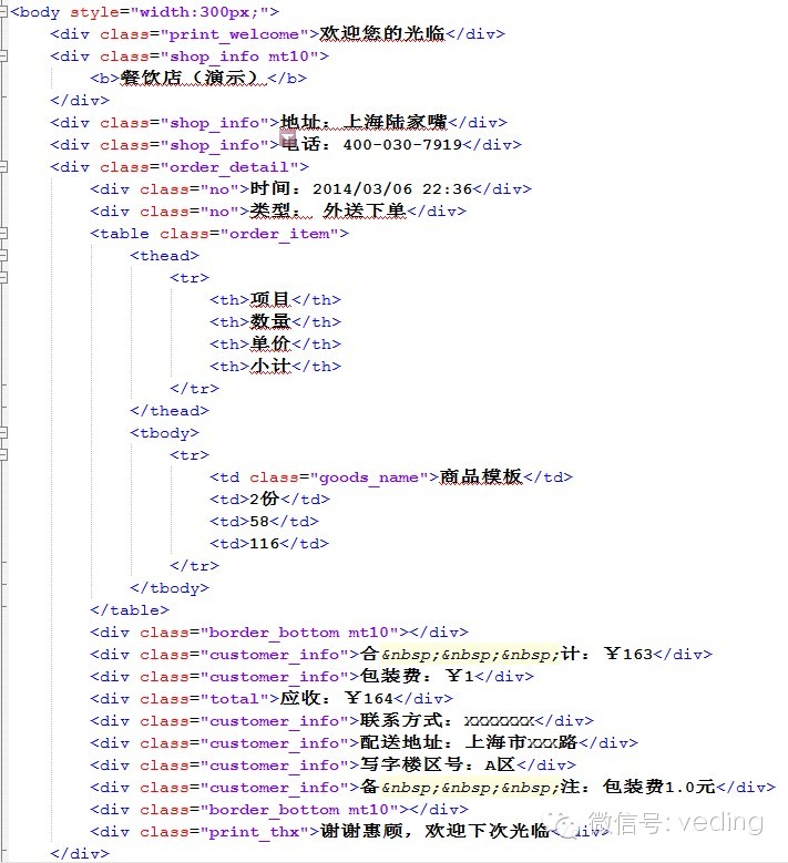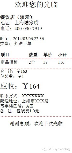 原理就是这样的,大家赶紧去定制您自己的小票格式吧。 上一条:手机界面清爽版和3G版改版啦 免责声明:部分文章信息来源于网络以及网友投稿,本网站只负责对文章进行整理、排版、编辑,是出于传递更多信息之目的,并不意味着赞同其观点或证实其内容的真实性,如本站文章和转稿涉及版权等问题,请作者及时联系本站,我们会尽快处理。 责任申明:官方所有内容、图片如未经过授权,禁止任何形式的采集、镜像,否则后果自负! 标题:后台小票打印格式支持自定义啦 地址:https://www.veding.com/static/v2/notice/85.html 相关资讯