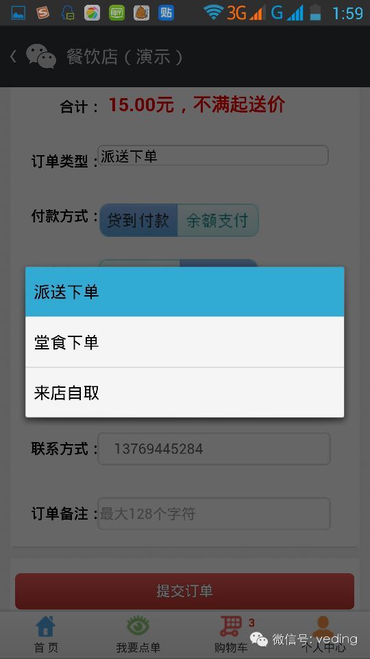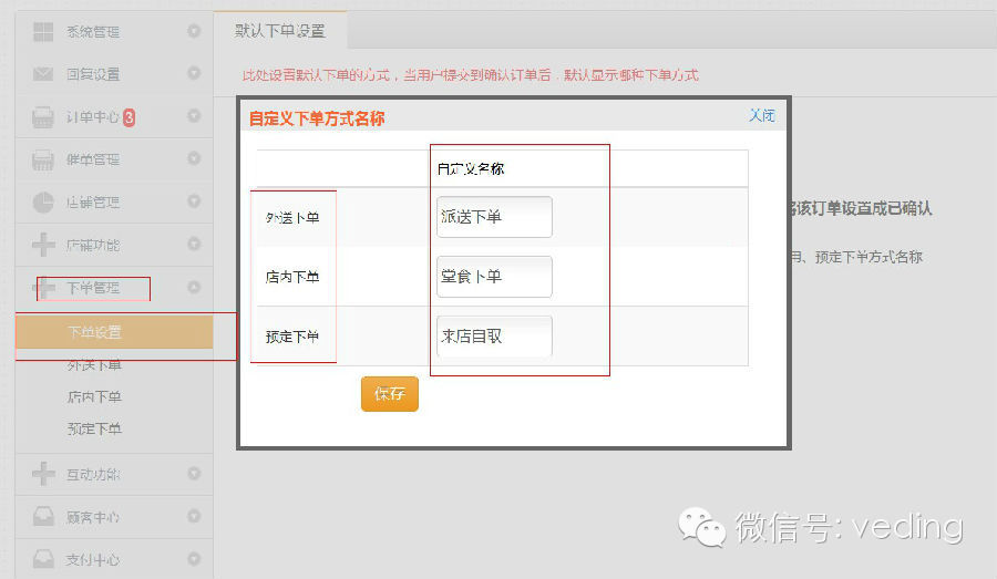 微订支持自定义设置下单方式名称 admin 发表于 2014-03-08 05:32:36 考虑到商家对下单方式名称的修改需求,这次我们做了灵活的设计,商家可以自定义下单方式了,比如,“外送下单”可以改成“派送下单”,“店内下单”可以改成“堂食下单”,“预定下单”改成“来店自取”等等,都可以灵活的根据需要来设置,让下单类型多样化,满足不同商家的下单需求。具体在哪里可以操作呢?其实很简单,看看先: 1、商家只需登录微订系统后,在下单管理板块中的“下单设置”进行“自定义下单方式名称”设置,如下图所示: 2、顾客通过手机提交订单时可以看到商家自定义的下单名称,如下图所示: 修改下单名称iPhone触屏动态界面: