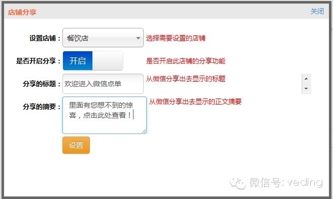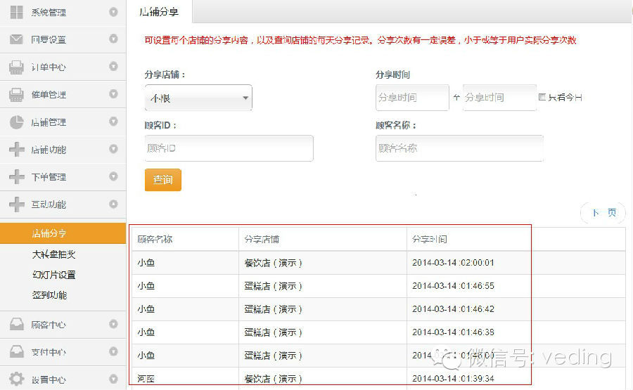 现在,微订为了让大家更好的宣传推广自己的产品店铺,特别推出了店铺分享功能,此功能还具备统计用户实时分享数据,例如,是哪个顾客分享的,分享了多少次等等都有统计,更好的监测分享的进程,算得上是开店推广,必备神器! 1、使用此“神器”之前,商家要做一些准备工作,在微订系统后台的“互动功能”中的“店铺分享”进行分享设置,必须设置开启才能分享哦,如下图所示: