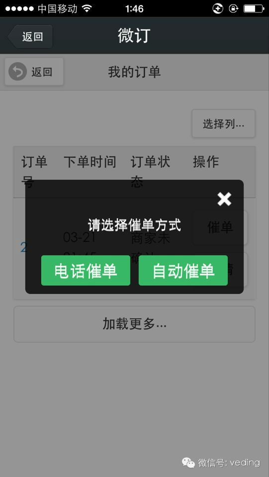 | 催单功能升级:支持电话催单和自助催单! admin 发表于 2014-03-21 02:23:53 催单功能再次升级啦!顾客手机端催单不再单调的自助催单了,商家也不局限于后台的铃声提醒接收催单信息了。一键电话催单,顾客无需输入号码即可快速拨打,及时与商家取得联系了,一键式操作方便了顾客,也方便了商家,大大提高了出单的效率,让微信点单再次便捷了,看看其庐山真面目吧。 顾客在个人中心中,我的订单,待完成订单里进行选择催单类型,可以选择电话催单,也可以选择自助催单,如下图所示: 下一条:微信店铺支持直拨电话功能 免责声明:部分文章信息来源于网络以及网友投稿,本网站只负责对文章进行整理、排版、编辑,是出于传递更多信息之目的,并不意味着赞同其观点或证实其内容的真实性,如本站文章和转稿涉及版权等问题,请作者及时联系本站,我们会尽快处理。 责任申明:官方所有内容、图片如未经过授权,禁止任何形式的采集、镜像,否则后果自负! 标题:催单功能升级:支持电话催单和自助催单! 地址:https://www.veding.com/static/v2/notice/99.html 相关资讯