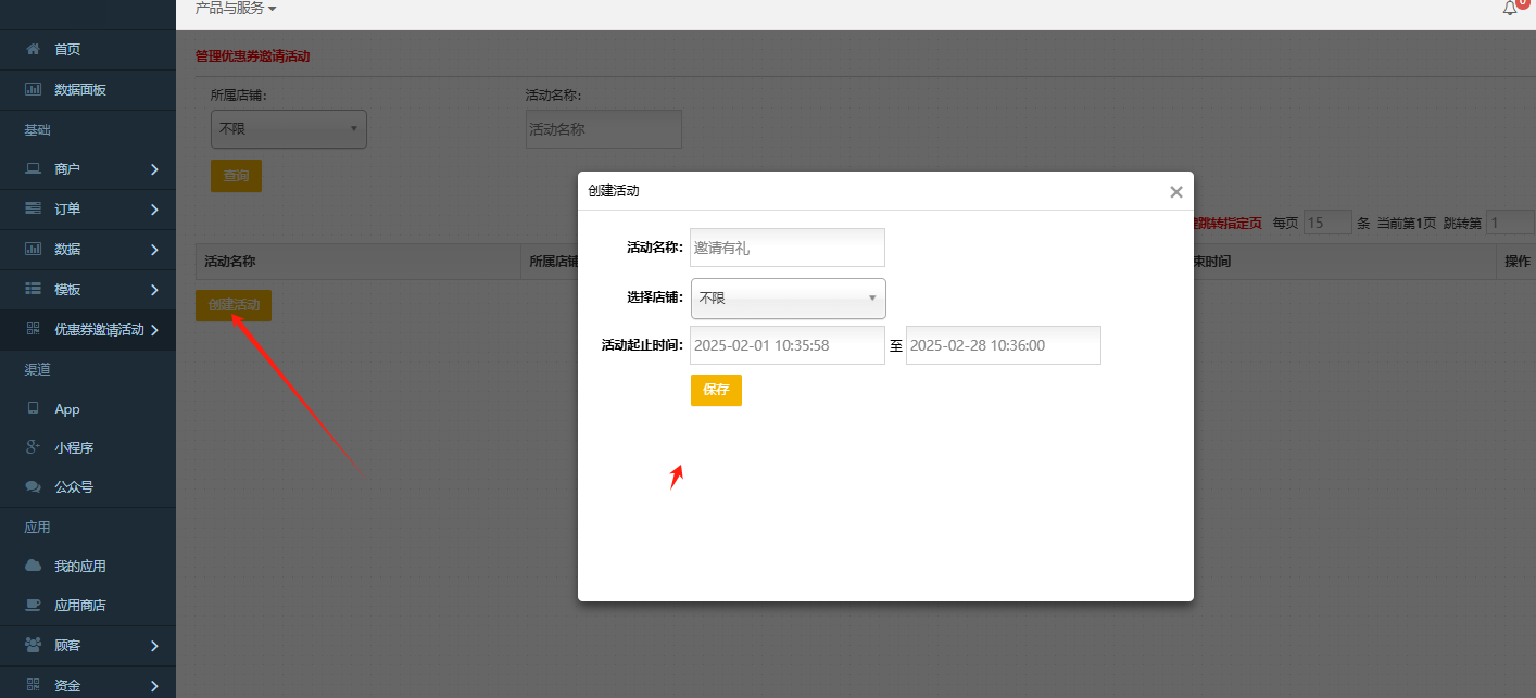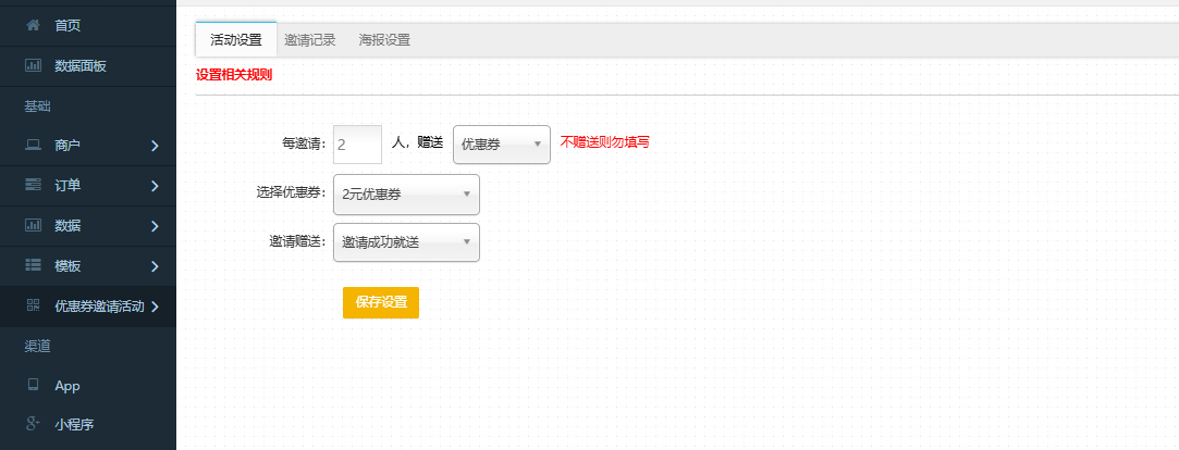 如下图所示,我设置的邀请2人才会赠送优惠券,设置好后点击保存即可